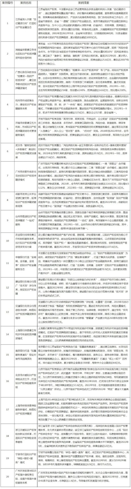 为发挥典型示范作用,进一步提升知识产权金融服务效能,按照《关于进一步加强知识产权质押融资工作的通知》(银保监发〔2019〕34号)《知识产权质押融资入园惠企行动方案(2021—2023年)》(国知发运字〔2021〕17号)有关部署,国家知识产权局、中国银保监会、国家发展改革委组织开展了知识产权质押融资及保险案例征集工作,在地方有关部门、有关金融机构报送案例的基础上评选出首批20个典型案例,现予以发布。请各地区和各有关金融机构加强典型经验的借鉴推广,积极稳妥推进知识产权金融服务工作,进一步深化部门协同和政银合作,推进业务模式和产品创新,提高普惠程度和服务效能,为中小企业纾困赋能,为经济高质量发展提供助力。