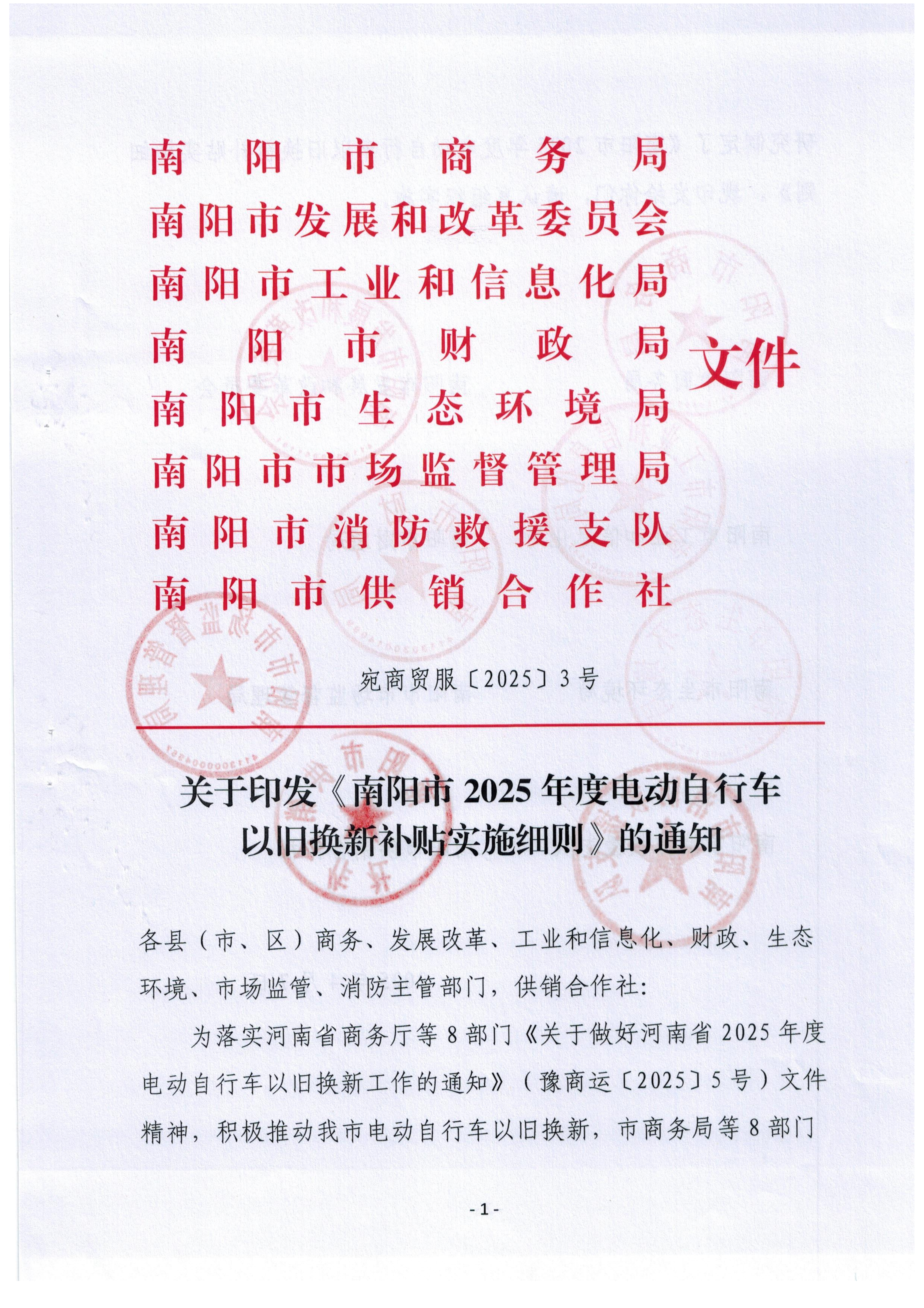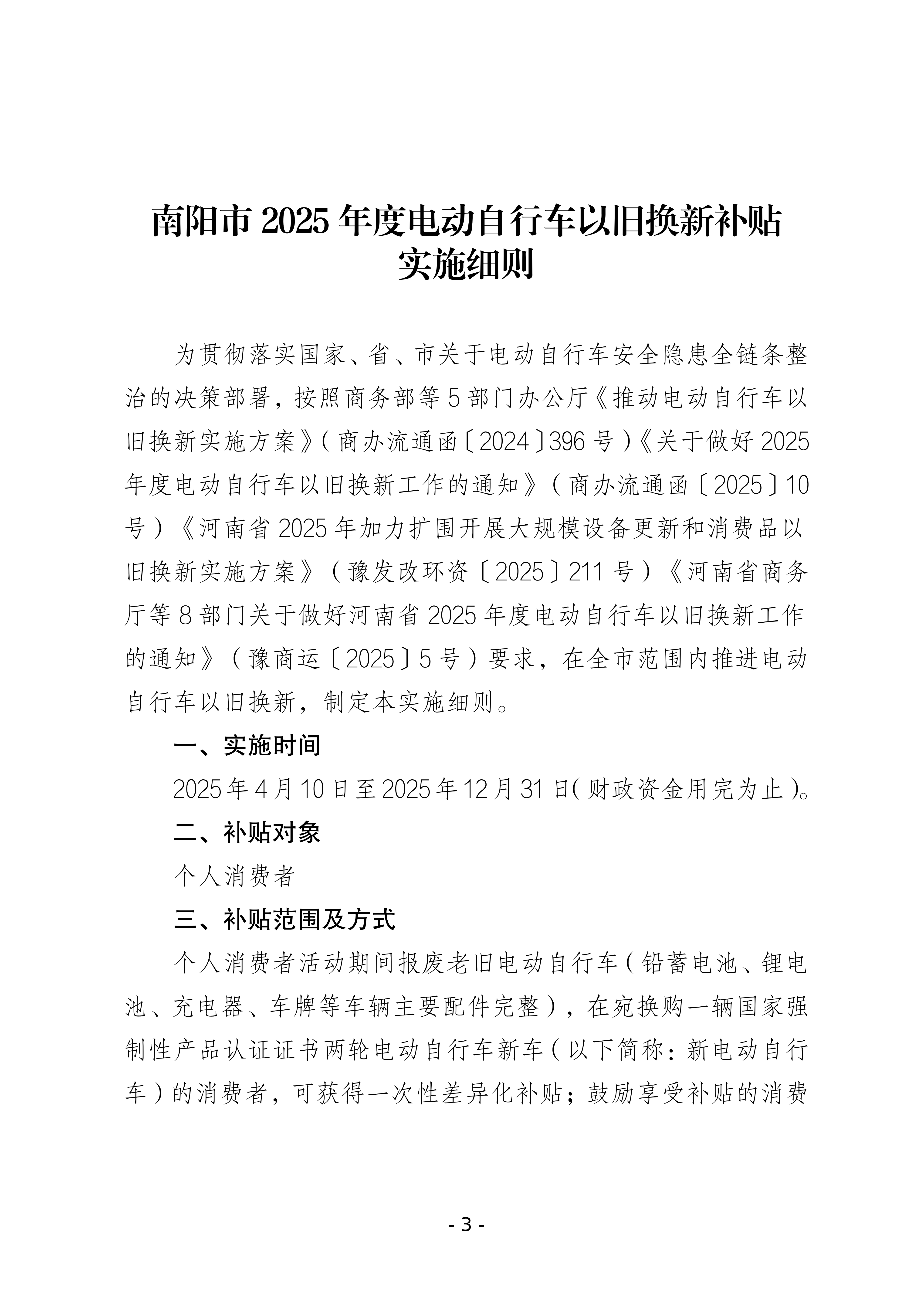 南阳市2025年度电动自行车以旧换新补贴政策